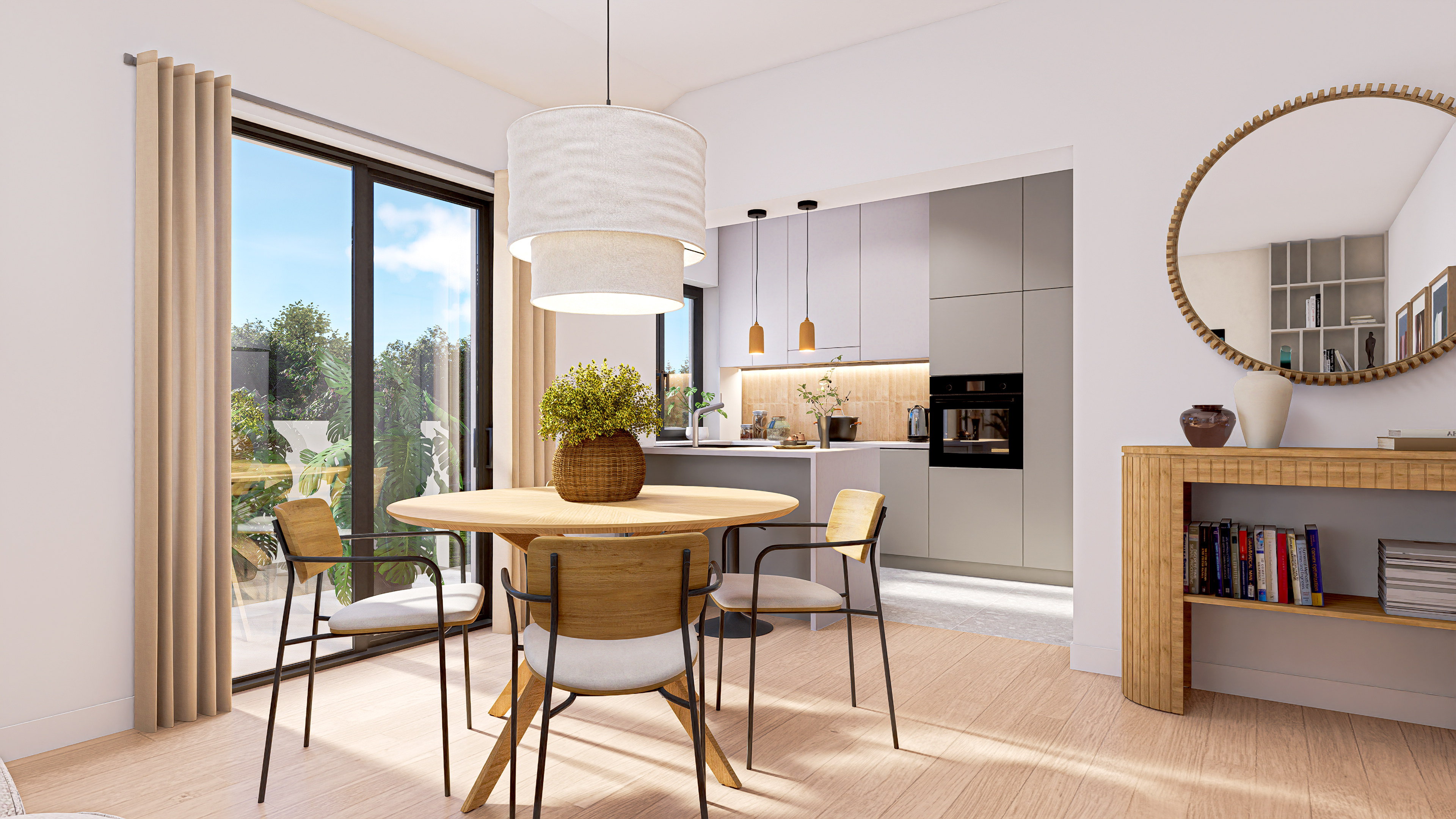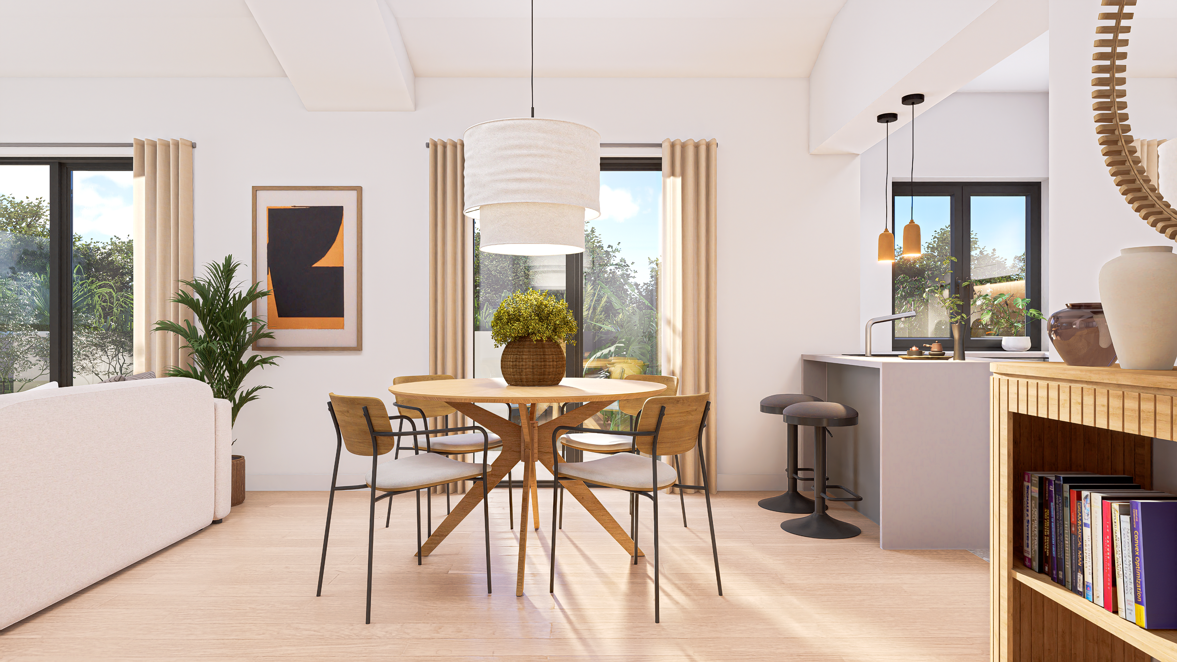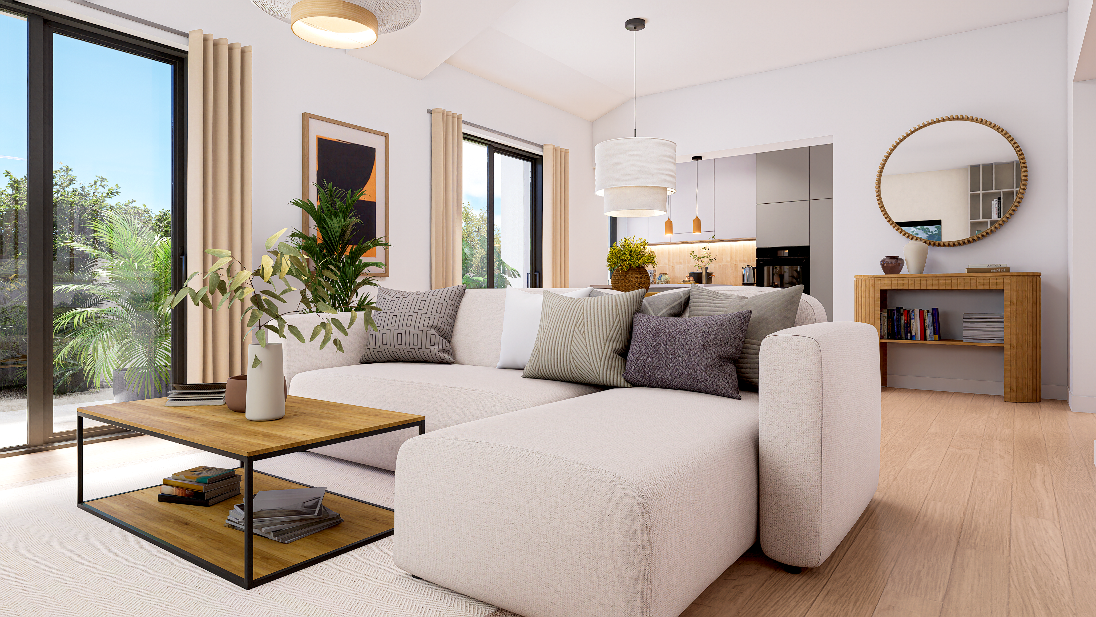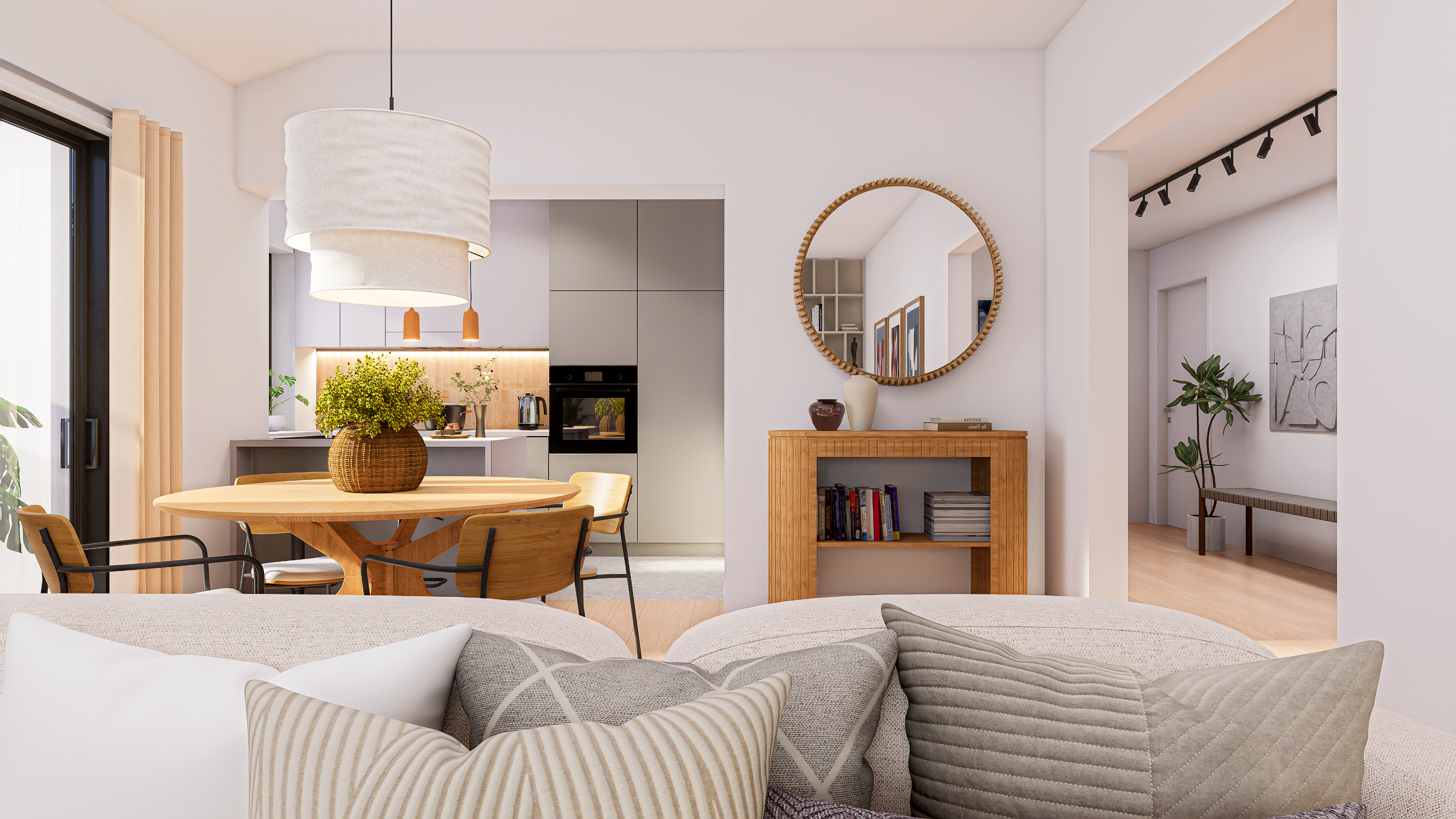 A bright contemporary interior inspired by Mediterranean living – natural materials, warm tones, and an emphasis on daylight.