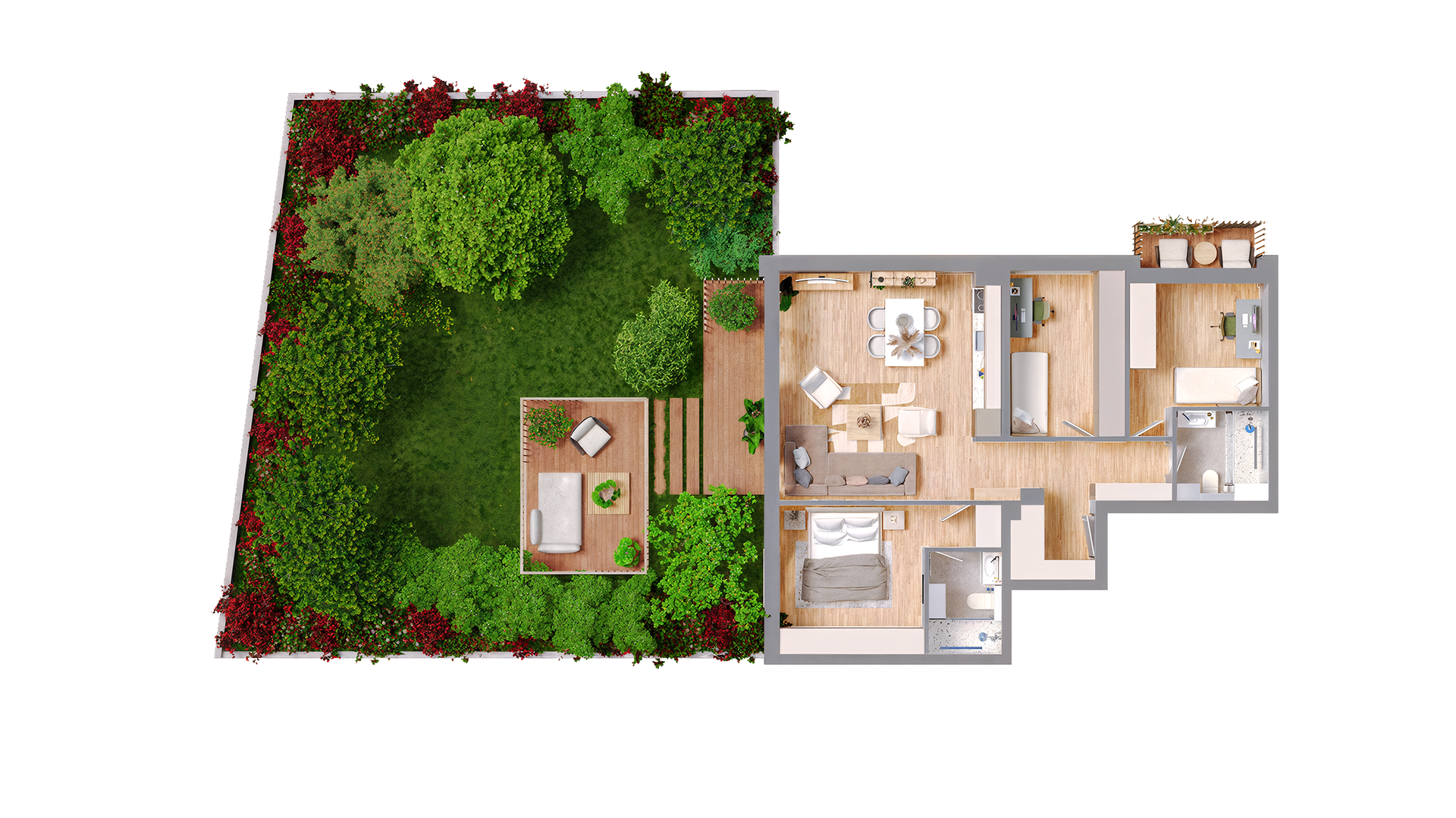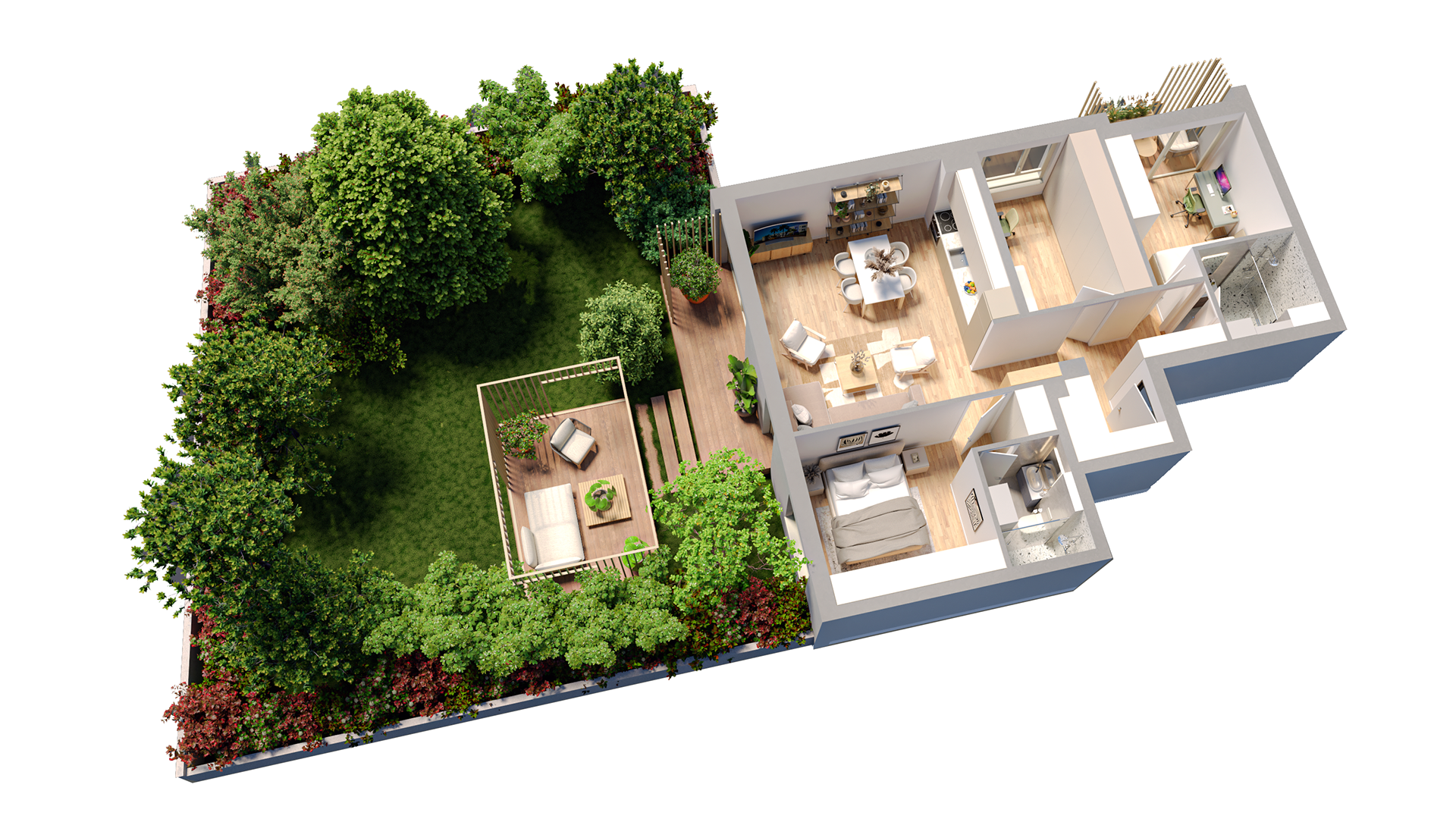 This project presents a thoughtfully designed apartment layout that emphasises comfort, functionality, and a strong connection between indoor living spaces and a private garden. The visualization highlights well-balanced proportions, natural flow between rooms, and a calm, inviting atmosphere, created to support clear architectural presentation and real estate communication.